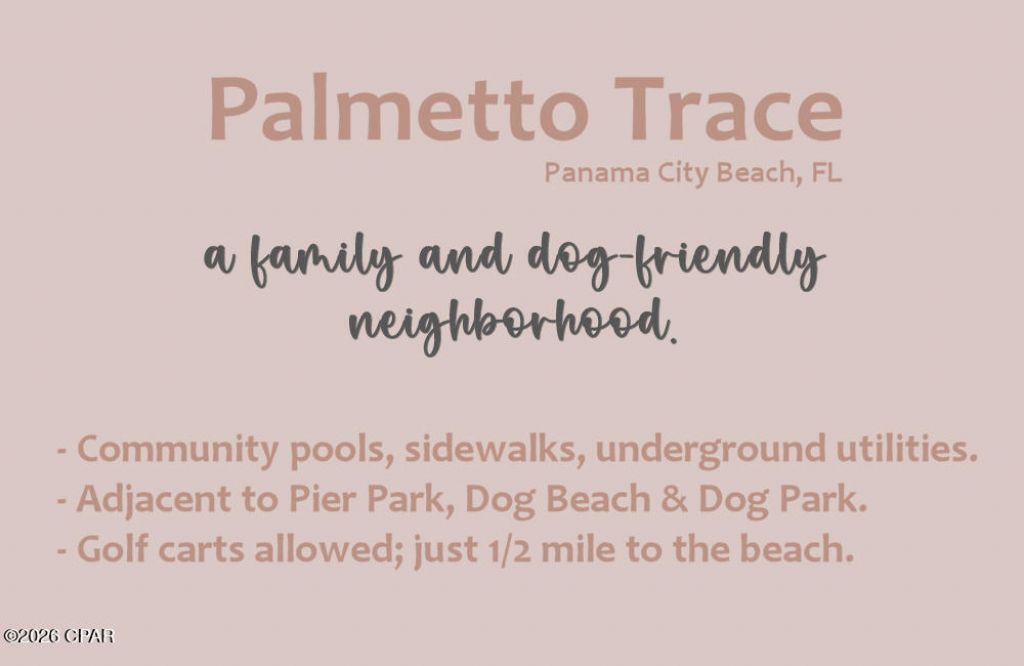 GOLF CART TO THE BEACH! Choose either furnished for a perfect second-home or unfurnished as a primary residence; at a discounted price. This home at 219 Oxford is turn-key and well maintained in a golf cart friendly neighborhood that is minutes to the beach. The large lot sits next to a natural preserve with a small lake. Palmetto Trace is ideal for a primary residence as a sweet family neighborhood with two pools, shaded gazebo with tables, scenic lakes, sidewalks, and tree-lined streets. The backyard has a new vinyl fence and was recently sodded. Enter through a welcoming foyer to an office or flex space through double doors to your left. The kitchen is spacious, open to the rest of the house, and features a chandeliered dining area. You will find custom features like a beautiful tray ceiling in the living room, plank flooring, kitchen sky light, wood kitchen cabinetry, built-in bar cabinet with cooler, security system, deluxe dimmable lighting, and surround sound throughout. The owner's suite has its own bathroom with a dual head steam shower, soaking tub, dual vanity, private toity room, and walk-in closet. The split floor plan places the second and third bedrooms at the front of the house with a full guest bathroom to share. The laundry room is complete with a full-size washer+dryer and leads to the oversized 2-car garage with storage shelving. There is a large, windowed sunroom off the living room, with portable ac, leading to an extended open back patio. The AC is brand new, exterior recently painted, roof was replaced in 2019 and there are easy to install hurricane shutters. Convenient to exciting Pier Park entertainment center, iconic 30A shoppes, highway for road trippers, and Beaches Int'l Airport. If you would prefer to purchase unfurnished, owners will clear it out. Reach out today for info and/or a tour to take a step closer to the coastal lifestyle you've always wanted!
